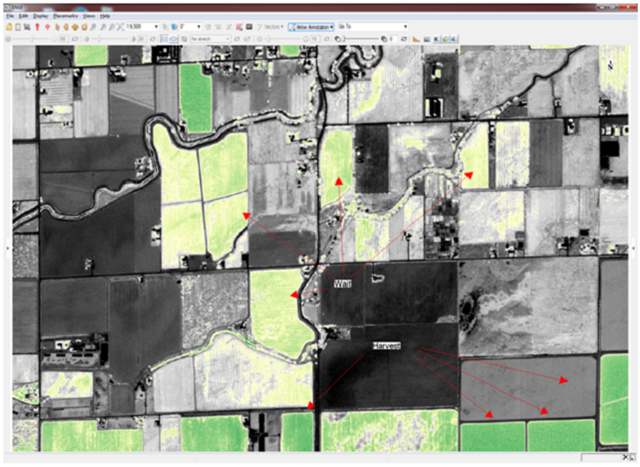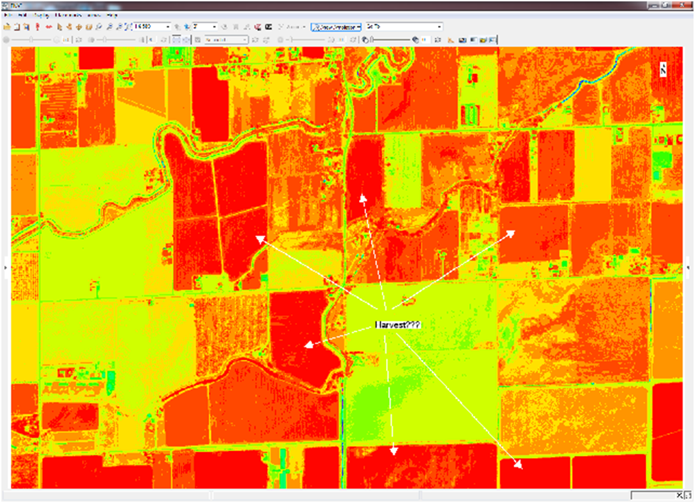 *Note: The best NDVI value for harvesting a particular crop is specific to each crop and unique individual field. This value is also subjective to an extent and is normally determined in combination with other vegetation indices and almost always with ground measurements. The values used in this example are not intended for production.