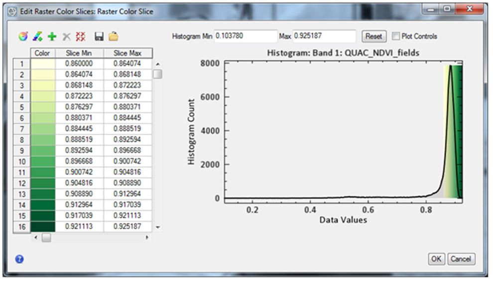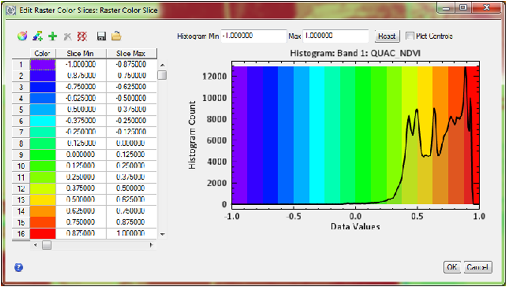 Raster color slice tool in ENVI. Blackplot represents NDVI image data histogram, colors represent each bin. Color range includes all data values from -1 to 1.
