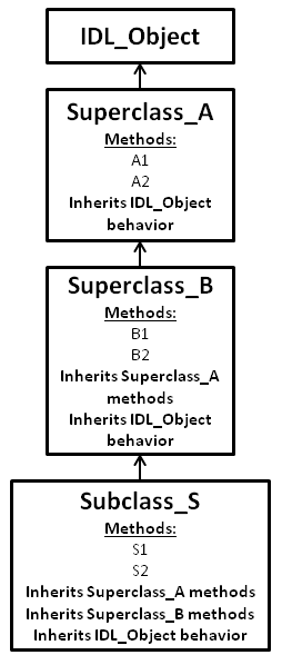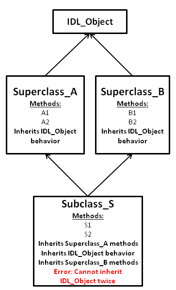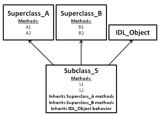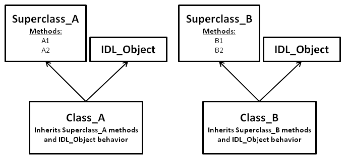 如果您想避免继承类时的混淆,可以将类结构设计为仅继承基类,即不继承任何其他类的类。在此模型中,Superclass_A和Superclass_B将是基类。您不会直接实例化或调用它们的方法,而是编写新的类Class_A和Class_B,它们将同时继承基类和IDL_Object(也是一个基类)。这些新的子类将是您实际交互的对象。
