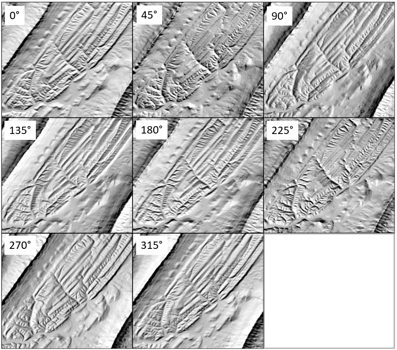 A blended hillshade image created with the Topographic Shading Tool simulates solar illumination from one direction. While you can set the azimuth angle to any compass direction, the output image represents illumination in that direction only. Areas that are not illuminated are cast in shadows, which obscures the details in the underlying relief. The following images show hillshade images created from specific azimuth values.
