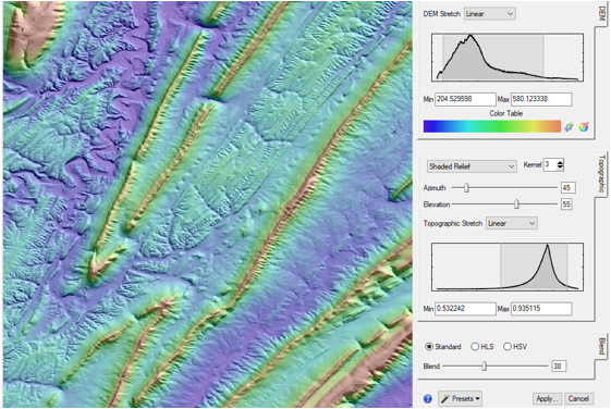This article provides some compelling examples of topographic images created from a DEM using the new Topographic Shading Tool, which will be available in the next release of ENVI in late summer of 2018. For illustration, I use a U.S. Geological Survey 1/9-arc-second DEM of the Appalachian mountains in Pennsylvania, USA. I also show how you can use the ENVI Modeler to create custom topographic effects such as multi-directional hillshading.