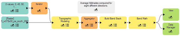 The concept of a multi-directional hillshade image has been around for several years. This type of image displays the shape of the terrain without being constrained to a specific solar viewing angle. You can easily create a multi-directional hillshade image in ENVI by building a simple model that includes using Topographic Shading functionality.