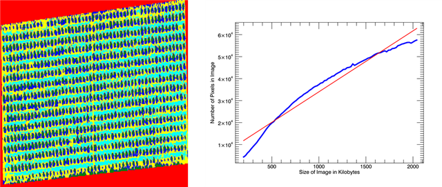 As a side note, I know what you are thinking, “if it is so difficult, why don’t you just choose a couple of sizes, try those out and then create a linear model so that in the future you no longer have to deal with this?” Well I tried it and it was a no-go. As you can see from figures 1 and 2 it is not a simple linear relationship, nor is it an easily predictable relationship. The blue lines in figures 1 and 2 represent the file’s size as compared to the number of pixels in the image; whereas the red line is a simple linear regression. It is possible to see a pretty distinct deviation from the trend line.