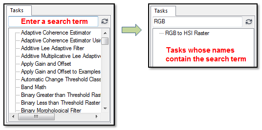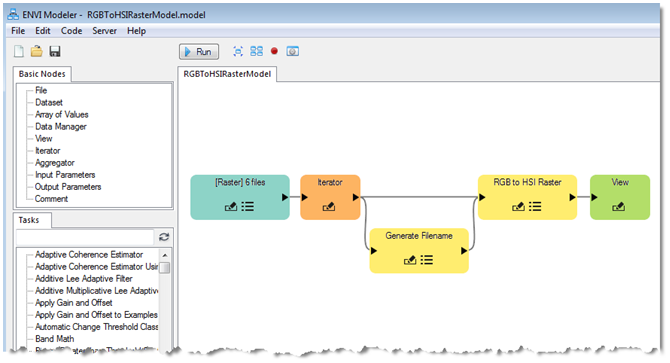 This model uses a File node (shown in the blue box) to point to six RGB input files. The primary job of this model is to perform an RGB-to-HSI conversion, so it needs a Task node that will do this. To find an appropriate task, you can enter a keyword in the Search field of the Tasks list: