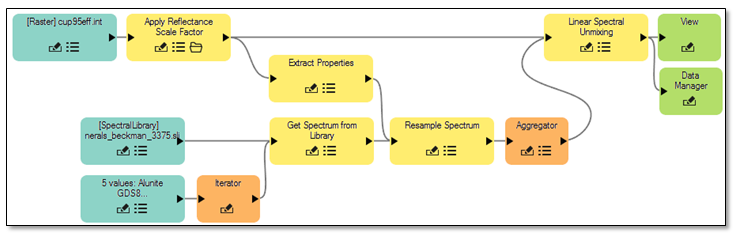 Here is another example of a model that runs through a full workflow for Linear Spectral Unmixing to determine the relative abundance of minerals in a hyperspectral image: