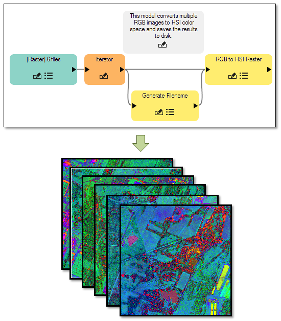In this case, the "RGB to HSI Raster" Task node will perform the RGB-to-HSI image conversion. An Iterator node allows you to batch-process the input files. Finally, a Generate Filename node lets you indicate where to save the output files, along with prefixes and extensions for the filenames. Running the model will produce six HSI images on disk: