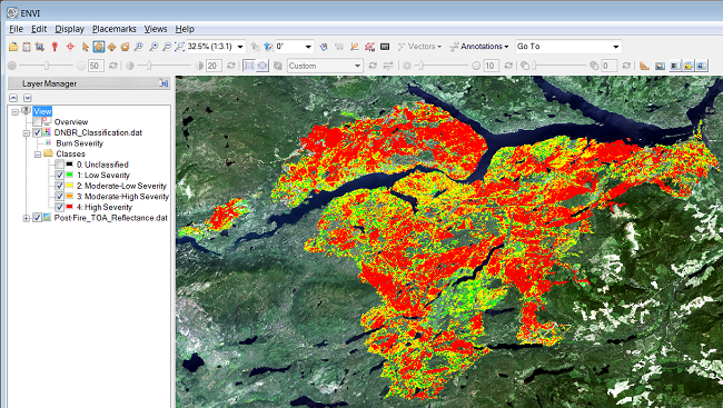 In my previous blog post back in January of this year I discussed "Using SWIR and LWIR Imagery to Analyze Forest Fires" which involved using Landsat 8 OLI/TIR data to analyze the Chelaslie River forest fire in British Columbia last summer (2014). In the earlier blog post I describe utilization of ENVI's Spectral Indices tool to compute the Normalized Burn Ratio (NBR) index for a scene that was acquired while the fire was still actively burning. As I mentioned in this previous blog post "the real power of the Normalized Burn Ratio spectral index is exhibited when you create pre-fire and post-fire NBR images then subtract the post-fire NBR raster from the pre-fire NBR raster to create a Differenced Normalized Burn Ratio (DNBR) image that indicates burn severity". However, at that time I was unable to find a good post-fire Landsat scene as most had either clouds or snow obscuring the burned areas.