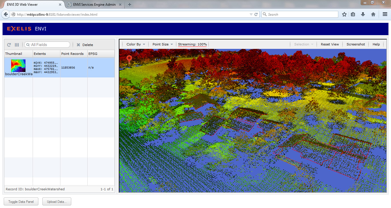 LiDAR 对传统的网络 GIS 提出了独特的挑战,包括数据量巨大以及可视化所需的三维环境。另一个挑战是 LiDAR 需要进行预处理工作,才能为流式传输和通过查看器使用做好准备。为了应对大多数 LiDAR 点云极其庞大的数据量,必须将其分解为更小的子集,以便在需要时流式传输到查看器中。这与瓦片地图服务通过仅提供应用程序请求的瓦片来降低带宽需求的方式类似。点云的分解是由 ENVI Services Engine 的一项任务执行的,该任务将数据分箱到四叉树结构中,并使其可供引擎进行流式传输。这允许对数据进行快速的空间查询,并提供在不同比例尺下显示数据所需的不同细节层次。