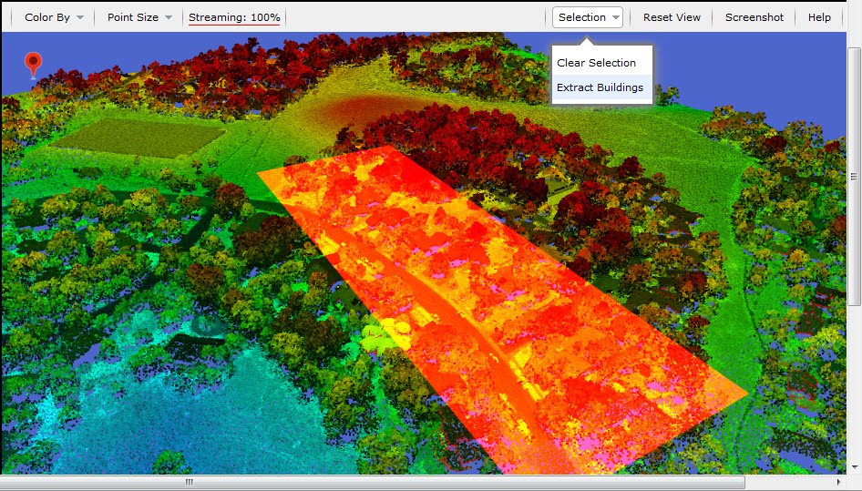 3D Web 查看器不仅能消费流式点云,还包含向服务器发送 http://RESTcalls 以启动 LiDAR 处理所需的功能。在此案例中,我们已将 ENVI LiDAR 自动建筑物提取 API 方法作为一项任务集成到 Services Engine 中。用户可以在查看器中指定一个矩形区域,该区域包含了他们想要从中提取建筑物的点。点击"选择 -> 提取建筑物"会将矩形的坐标作为 REST 调用的一部分,连同要分析的数据集及要对其运行的分析,一并传回引擎。一旦特征提取算法完成,生成的 shapefile 将被写入指定目录,随后从服务器流式传输出来,以在 3D Web 查看器中显示。