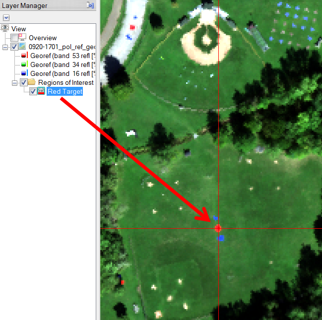 In the RGB composite image display the pixels that have the highest value match to the input target in each of the three different spectral mapping algorithms will end up being pure white. Consequently, if you keep your eye on the bright red pixels from the input hyperspectral image you will notice they are "bright" in the RGB composite image comprised of results from the target detection algorithms. What is interesting to notice is how the red targets in shadow next to the trees at the southern end of the open field have a distinct magenta appearance which suggests that the ACE and MF algorithms did the best job identifying these targets (i.e. red + blue = magenta). Furthermore, one of the other bright targets in the parking lot toward the top of this scene has a bright green appearance in the RGB composite image suggesting that the CEM algorithm identified this region as a match which is probably a false positive in this target detection scenario.