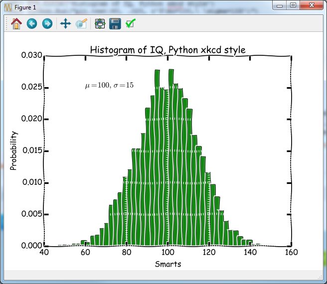 IDL> plt.title('Histogram of IQ, Python xkcd style')