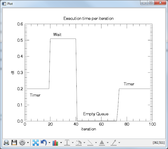 Iterations 20 through 40 are executed with a 0.51-second delay, over twice the timer object's repetition interval. This simulates a heavier CPU load and helps to show that the timer continues to run and queue events at its own rate in the background.