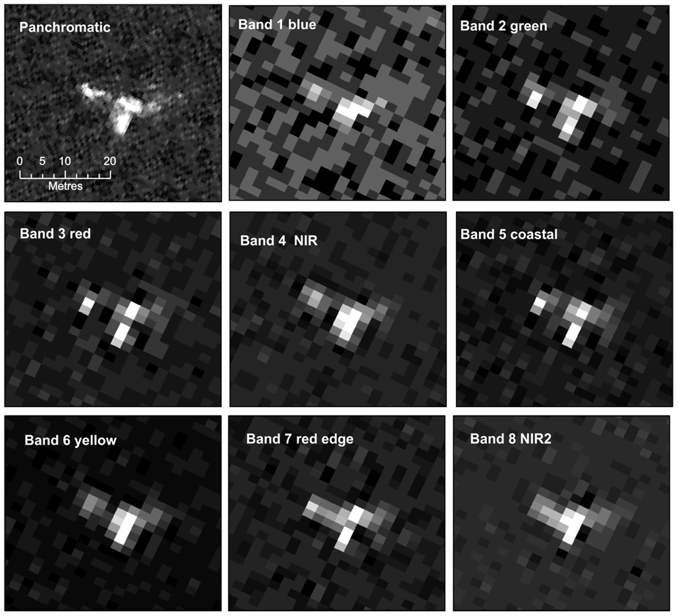 Single band images of a probable right whale in the satellite image from each of the eight multispectral bands and the panchromatic band of the WorldView2 data. Reprinted under a CC BY license with permission from British Antarctic Survey and DigitalGlobe.