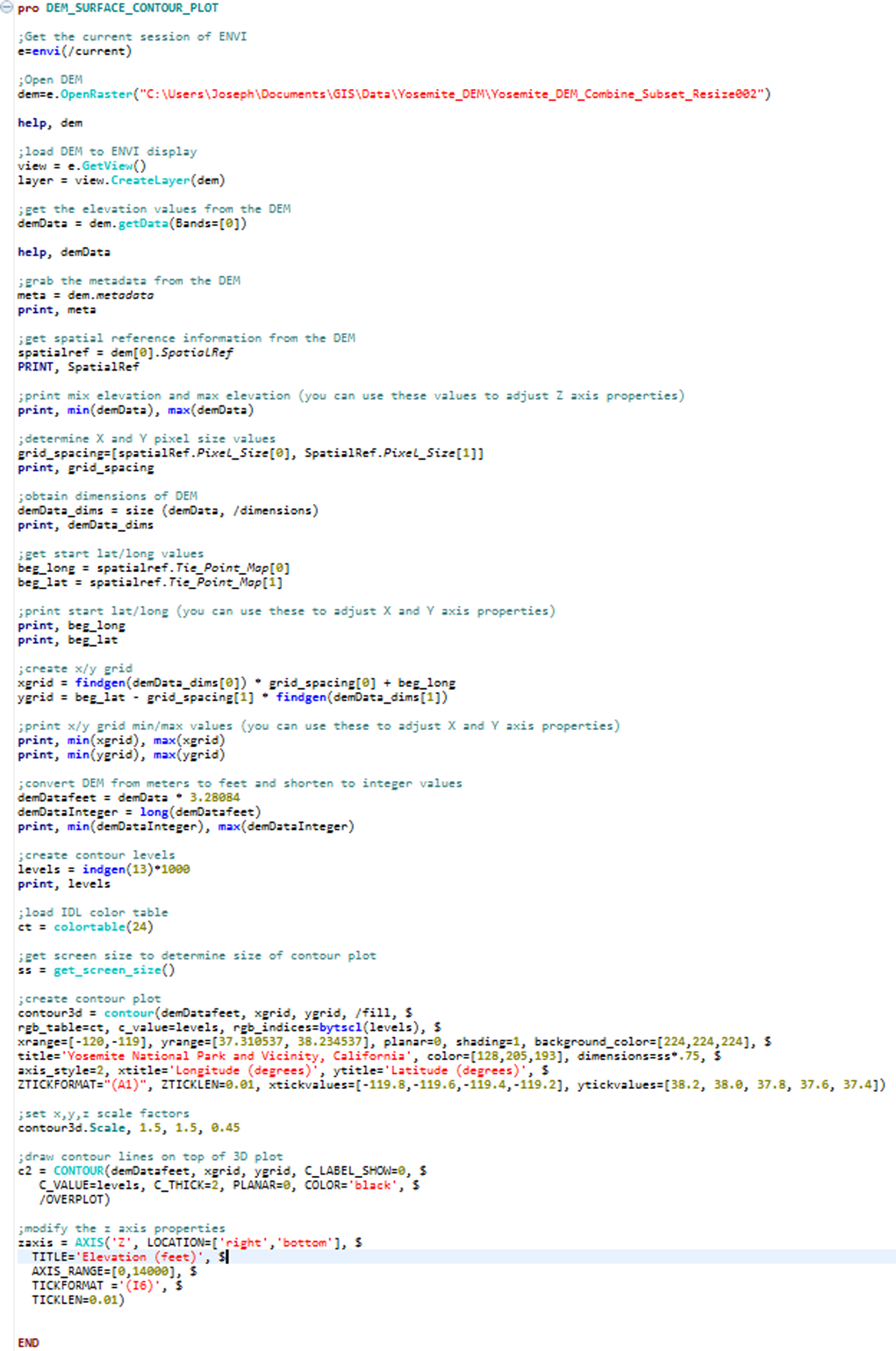For this example, I downloaded a couple of 1/3 arc second USGS DEMs from the National Map Viewer. I first mosaicked the two DEMs and then resampled them slightly to decrease the file size so that they would be more performant in IDL. I then wrote the code which produces the three-dimensional representation. The code opens the DEM file, extracts information about lat/lon extent and pixel size, then draws a grid upon which elevation values can be plotted. Once I figured out how to get this to work, I chose an IDL color table to display elevation ranges, added contour lines, and made some fine-tuning adjustments to the axes labels. There are tons of different adjustments that can be made, so building a custom three-dimensional visualization really does allow users to use their imagination. For reference, my code is shown below: