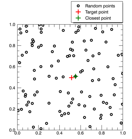 IDL 8 Graphics (aka New Graphics, aka Function Graphics) are interactive, and you can customize the event handlers of the graphics' windows. Therefore, you use IDL 8 Graphics to generate pretty good GUI applications without building a widget from scratch. Thus, a solution to the problem (2) is to generate a scatter plot with the original data and then customize the MOUSE_DOWN_HANDLER to allow the user to select “target” coordinates in the plot, then you can use the solution to problem (1) to find the closest data point and display this information.