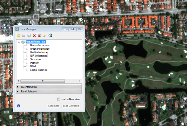 例如,下面的栅格包含了使用ENVI从空客防务与空间公司Pleiades-1A卫星获取的源影像中提取的特征。源影像是四个光谱波段的采集结果:蓝光 (495nm)、绿光 (559nm)、红光 (656nm) 和近红外 (843nm),于2014-10-04 16:14 UTC(当地时间约中午)在美国佛罗里达州(中心位置 25°42'44"N, 80°25'44"W)上空获取。