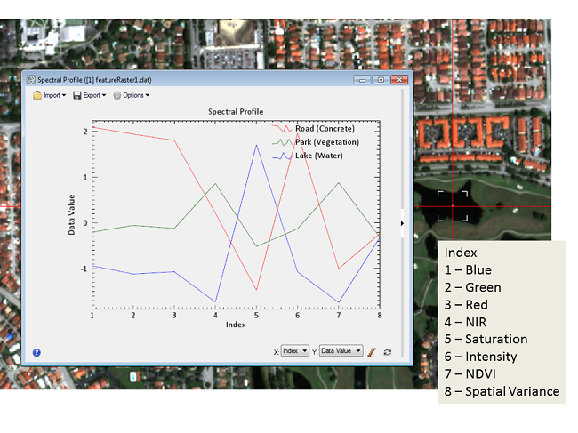 从光谱剖面查看器中,我们看到道路、公园和湖泊产生了三种不同的特征向量。从1到8的索引代表八个已定义特征中的每一个,数据值代表该特征的归一化值。
