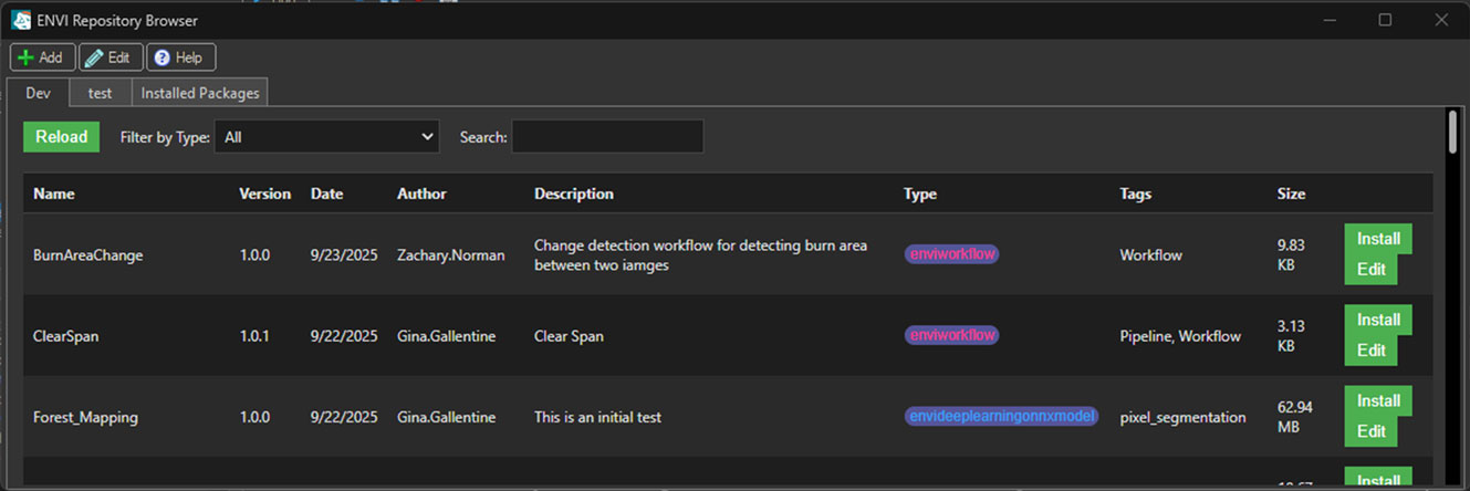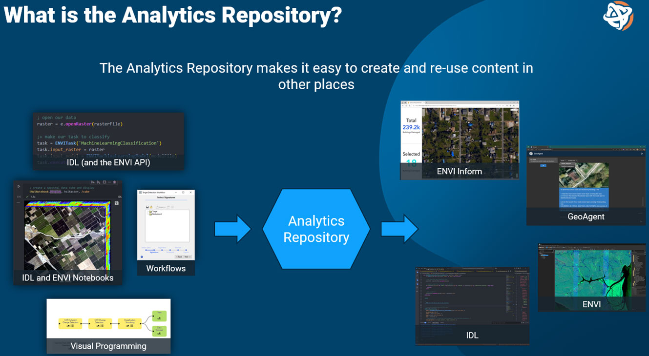 The Analytics Repository was included in the release of ENVI 6.2 and IDL® 9.2, and is a new piece of server-based software that enables users to create, share, and install content from others within their organization.