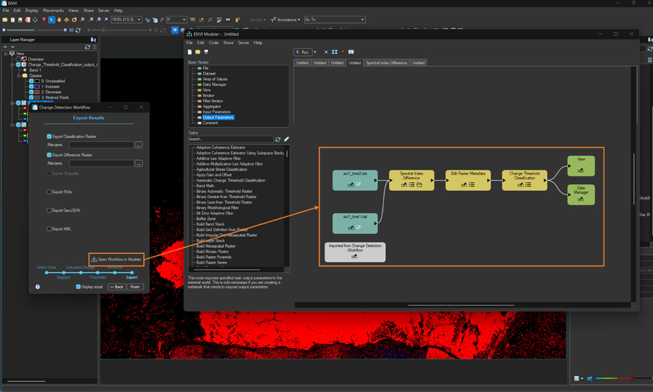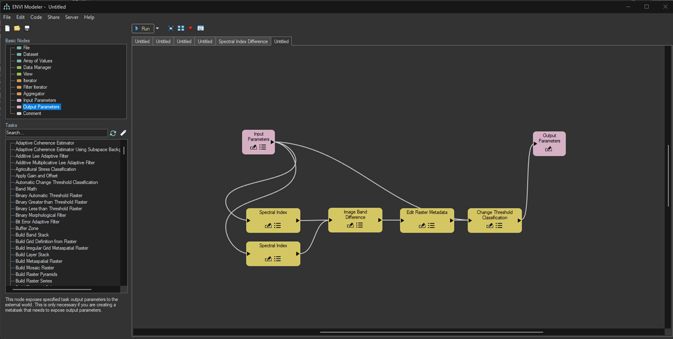 One important pattern to try and follow is that, for any output raster or vector, you want to have the file path for that dataset as an input parameter. This follows ENVI patterns and makes sure users have access to all the relevant parameters. You can see how I have Input and Output Parameters connected to the Change Threshold Classification step to do just this.