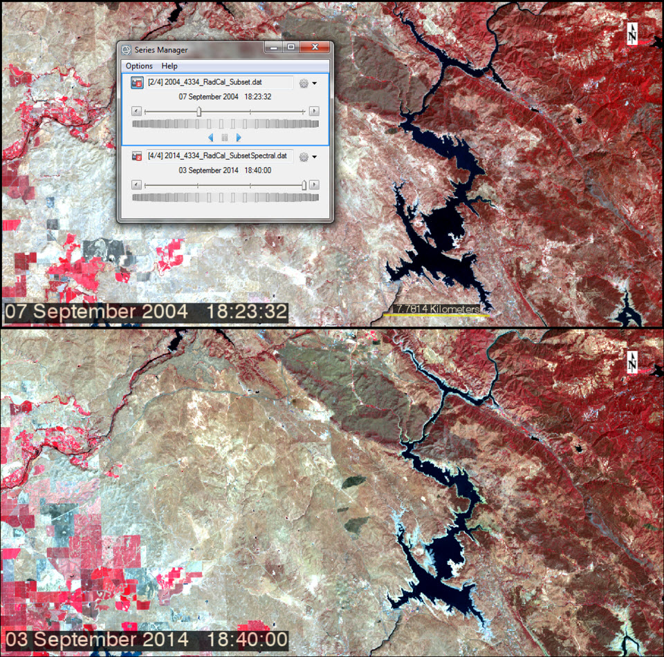 We will begin our case study by using the new Spatiotemporal Analysis tools available in ENVI 5.2 to quickly step through the images of our scene to view the changes that have occurred throughout time. The Spatiotemporal Analysis tools allow users to step forward and backward through a series of images and also allow for quick annotation of such information as a scene's time and date of acquisition. An animation of your time series can also be exported to many common video formats. Using the Spatiotemporal Analysis tools we can begin to get an idea of how water levels in the reservoirs depicted in our scene have changed throughout the time period represented by our images.