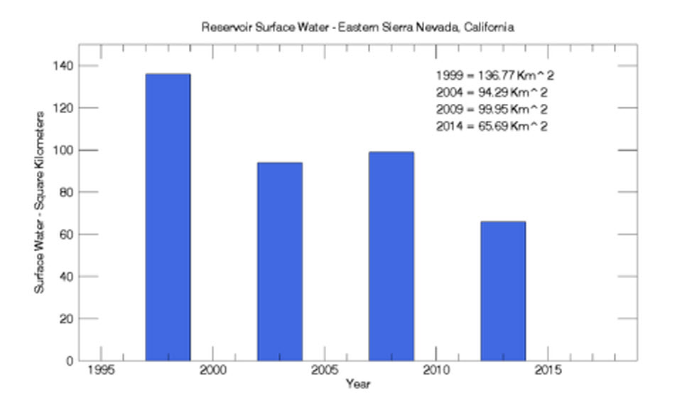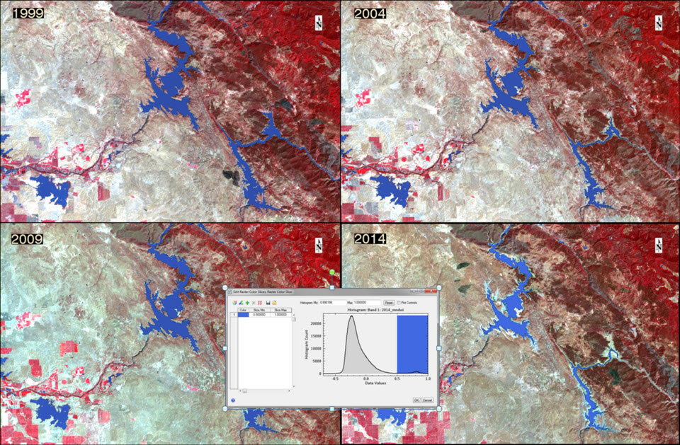 Now that we have the information we are looking for we can compare the amount of surface water across the scenes in our case study. Results show that in 1999, reservoir levels were at their highest level throughout the period observed. Following a drastic decrease between 1999 and 2004, water levels went up slightly between 2004 and 2009. In 2014, another drastic decrease in water levels was observed.This drastic drop in reservoir water levels is indicative of the major drought that is pervasive throughout the region. Using IDL we can quickly generate a bar plot to show the results of our findings. If you are interested in becoming more familiar with the tools that I presented in this case study, please check out this Tutorial, which examines urban growth in Las Vegas using Landsat imagery.