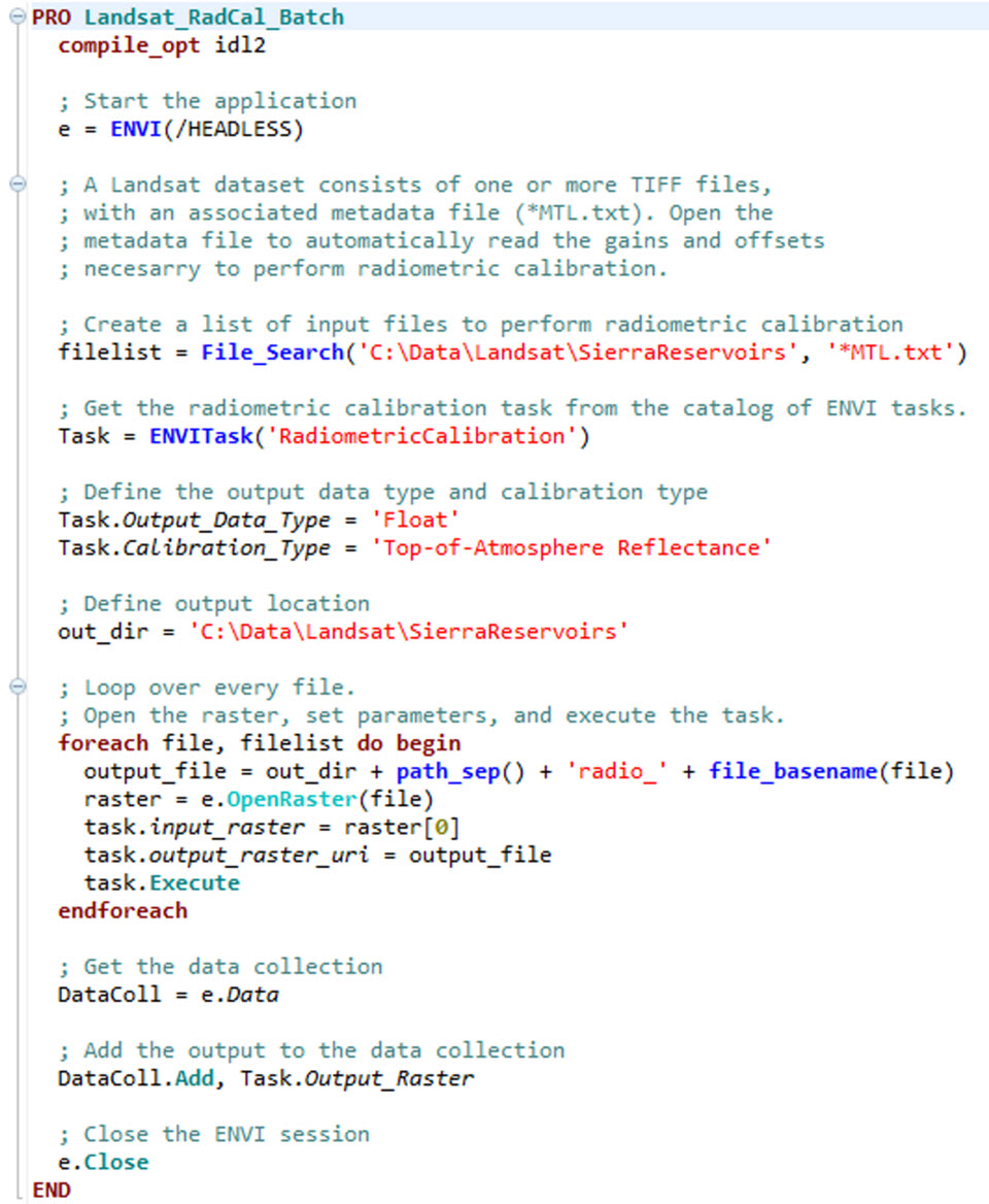 In ENVI 5.2 we have introduced something called an ENVITask, which simplifies and speeds up the pre-processing and analysis of imagery. ENVITasks are multi-threaded, which means that ENVI will take full advantage of working on a machine with multiple cores. ENVITasks are accessible in the ENVI Toolbox or they can be run as batch processes through the ENVI API. The nice thing about ENVITasks is that they all follow a very simple and standardized format, so once you get the hang of working with an ENVITask you can easily repeat these steps with other ENVITasks or chain multiple ENVITasks together to run all at once. ENVITasks are also available out-of-the-box with the ENVI Services Engine, which allows for use of these algorithms in an enterprise or web-based environment. For this case study, ENVITasks were used to radiometrically calibrate, atmospherically correct, and apply a spectral index to the scenes. The ENVITask I wrote to perform Radiometric Calibration on the Landsat images is shown below. This code is very straight forward and is mostly taken directly from the documentation of this ENVITask. With this now written, I can simply change a couple of lines of the code which point to my input and output directories in order to run it on any other imagery I might work with in the future. Pretty cool, right?