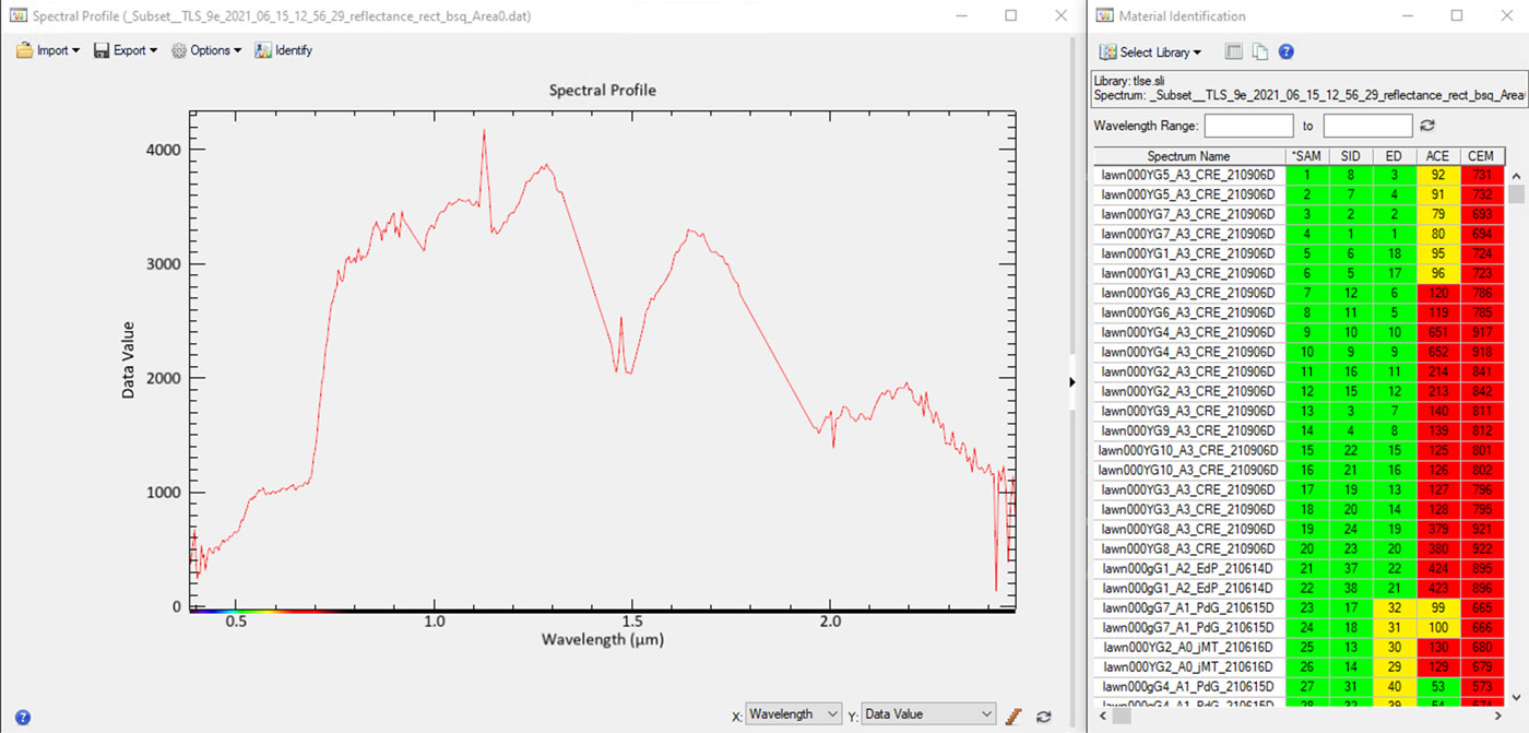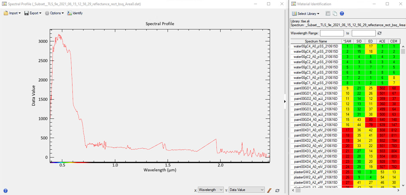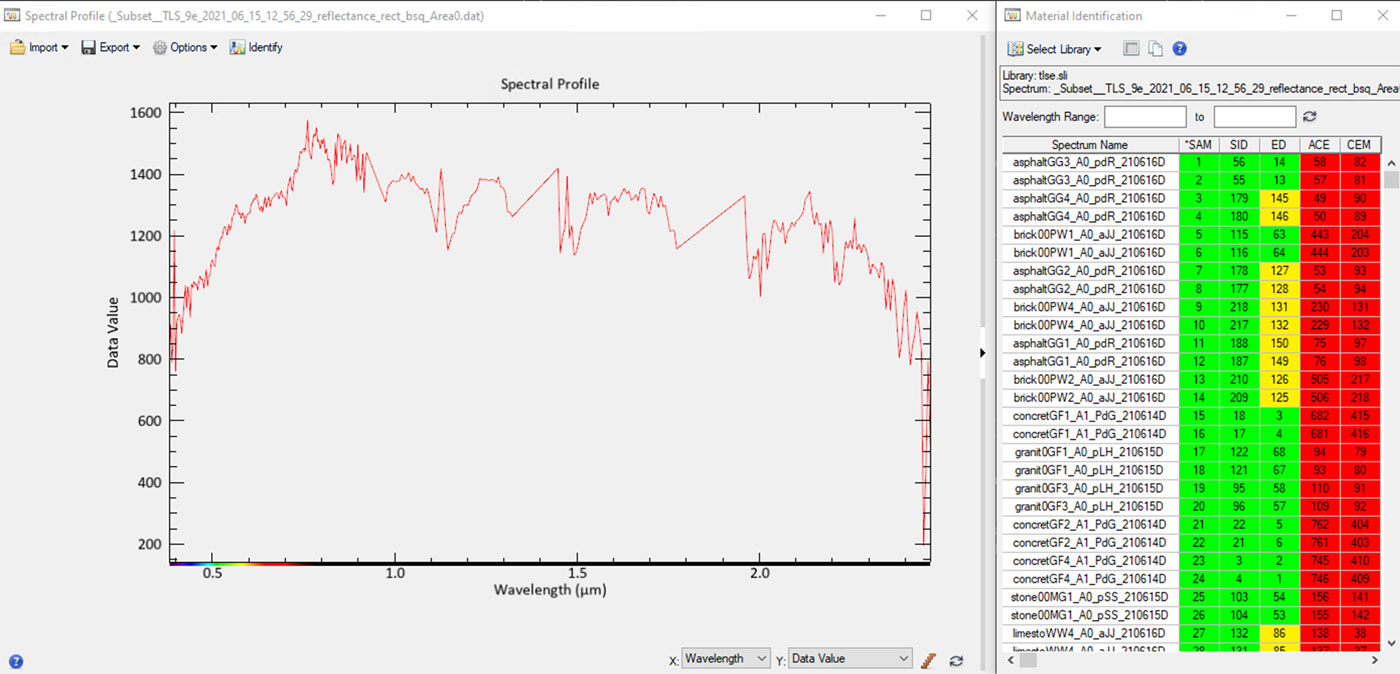 Next, I took subset of one of the hyperspectral images from the Toulouse dataset and opened it in ENVI. Using the spectral profile tool, I clicked on the “Identify” button, which opens the “Material Identification” dialog – a powerful feature introduced in ENVI 6.0. By selecting the “tlse.sli” spectral library, you can start to identify materials in the image with just a few clicks. Let’s explore some examples: