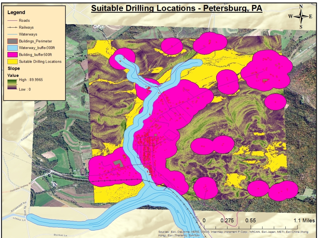 作为最后的考量,我研究了钻井场地的平均面积,以确保有足够的空间进行作业。根据页岩气信息平台,用于钻井和压裂阶段作业的多井井场的平均面积为3.5英亩。我使用了ENVI中的聚类和筛除功能,移除了那些面积小于3.5英亩的坡度区域。从下面的最终图像中,你可以看到水体和建筑物的缓冲区,以及用黄色显示的适宜钻井区域。