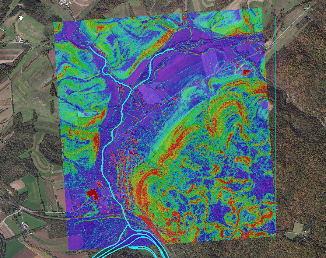 在本案例研究中,我在 Open Topography 上找到了一个位于宾夕法尼亚州彼得斯堡镇的绝佳激光雷达数据集。彼得斯堡位于宾州中部的马塞勒斯地层上,这是美国最大的天然气来源。从这些激光雷达数据中,我能够提取高分辨率的数字高程模型 (DEM),以及场景内所有建筑物的矢量数据。我从美国人口普查局下载了一些包含该地区水体的矢量文件,这将使我能够确保符合州的退让法规。
