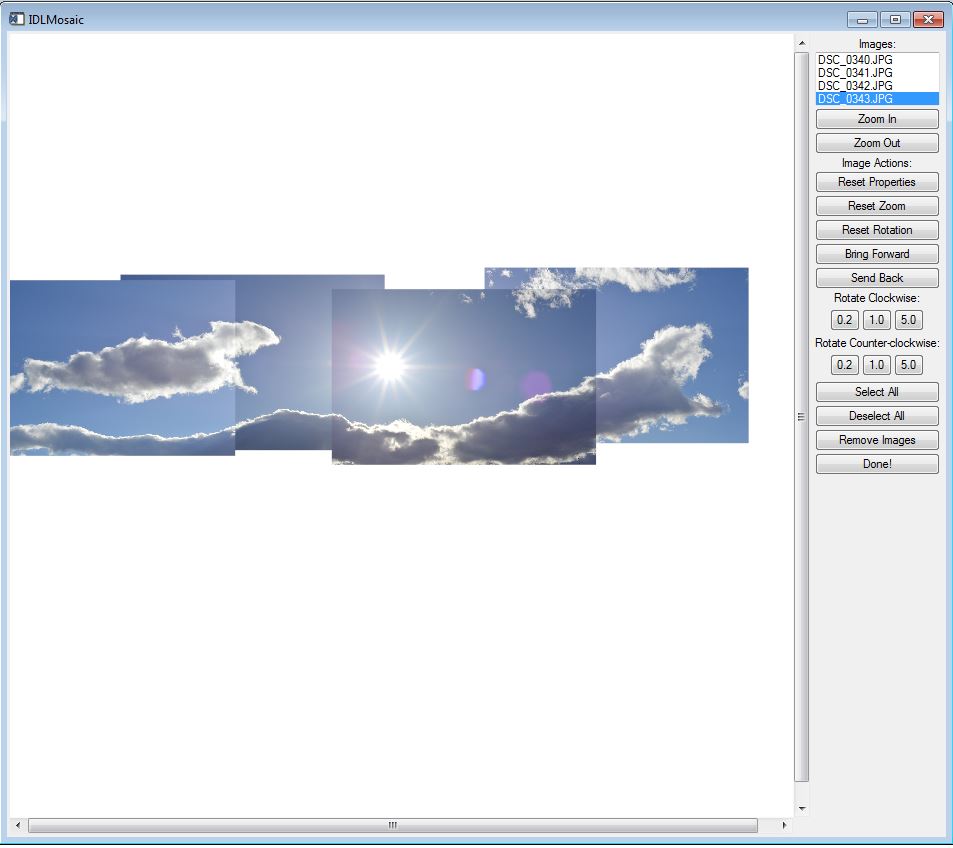 要使用该工具,您需要下载代码(见下文)。获取代码并运行程序后,会出现一个对话框,要求您选择要加载的一些图像。允许的格式是任何能被 IDL 的 READ_IMAGE 函数读取的图像。选择图像后,将出现上述的小部件界面,您可以对选中的图像(蓝色框框住的图像)执行不同的操作。要将图像加载到显示中,只需在图像右上角的文件名上双击即可。如果任何图像的位置、方向或缩放变得奇怪,只需选中该图像并按"重置属性"按钮。