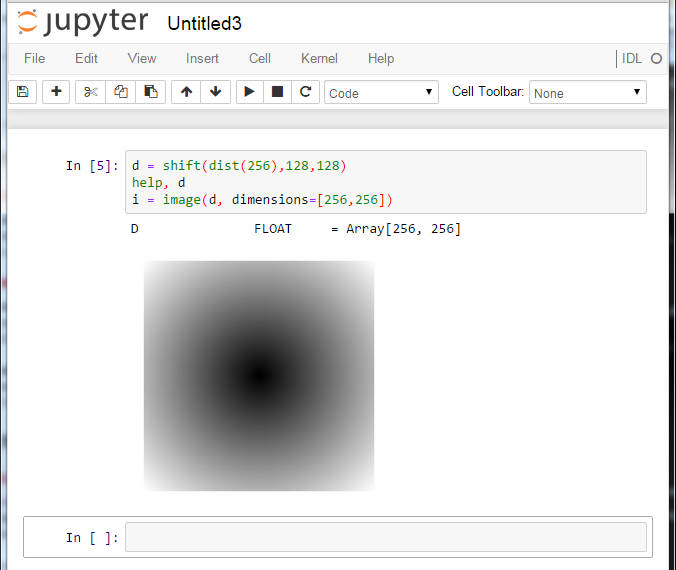 Text output from IDL, for example from HELP or PRINT, will be echoed to the web page, as will certain types of graphics. Output is queued until an entire code cell has executed.