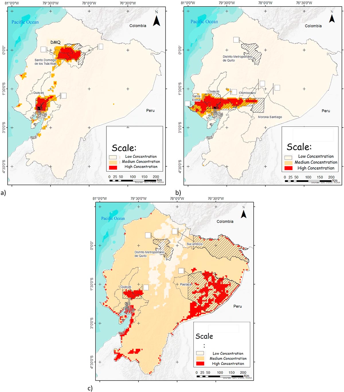 图 1. 厄瓜多尔大陆各省的 a) NO2浓度;b) SO2浓度;c) O3浓度。