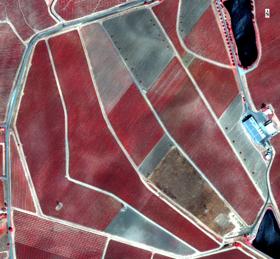 Let's take a quick look at an example of how high resolution imagery can be used to help manage crop yield. In this example, we will be looking at vineyards in Napa Valley, California. The imagery we will be using is from the Pléiades system from Airbus Defense & Space®. With a spatial resolution of approximately a half meter per pixel, we can take a very close look at the health of crops. The image below was captured on June 30, 2014, and shows several vineyards in Color Infrared (CIR). By looking at the image, we can gain a quick understanding of where grape vines are growing and where they are most healthy by observing which areas are most saturated with red.