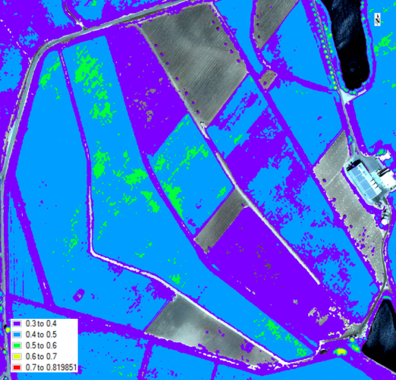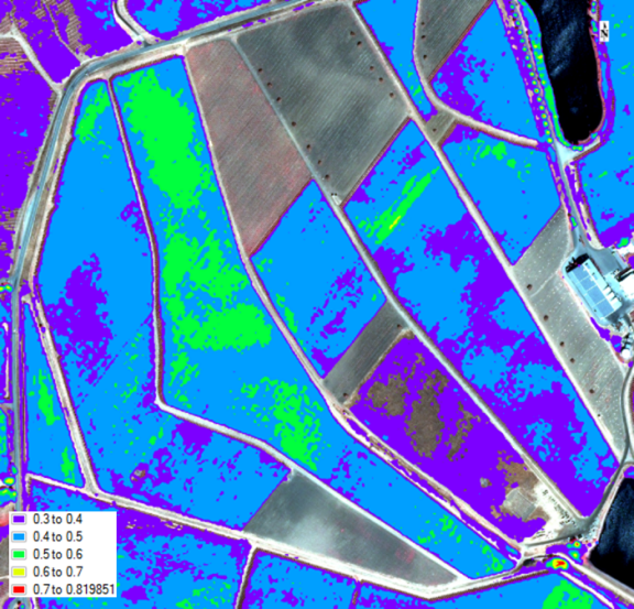 With this information at hand, growers can modify operations to correct for growth inconsistencies. With the rapid revisit times offered by today's commercial satellites and the potential of the UAS market to provide fast and cheap acquisition of new imagery, operations can be monitored on a regular basis to ensure optimum productivity. The image below shows the same area with analysis performed on an image captured on September 10, 2014.