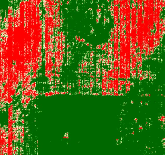The resulting image shows variable health across the Hemp field, with the color Red indicating negative values (poor health) and the color Green showing positive values (Healthy). This simple analysis can help agronomists, advisory services or anyone interested in the relative health of a field.