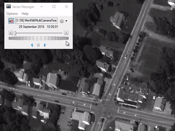 An important aspect of working with MIE4NITF is the ability to analyze individual frames, or NITF images. The ENVI Series Manager allows an analyst to load specific images within a series to the ENVI Layer Manager for further analysis. Metadata are encoded as NITF Tagged Record Extensions (TREs). Right-clicking on a single image layer displays the NITF metadata for that image.