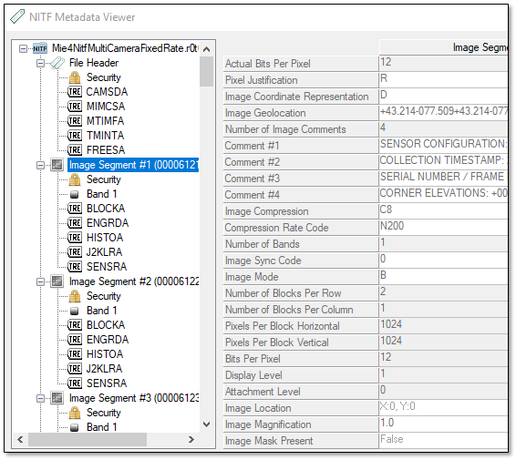 NITF Metadata Viewer in ENVI, showing metadata for a single image segment within a MIE4NITF series.