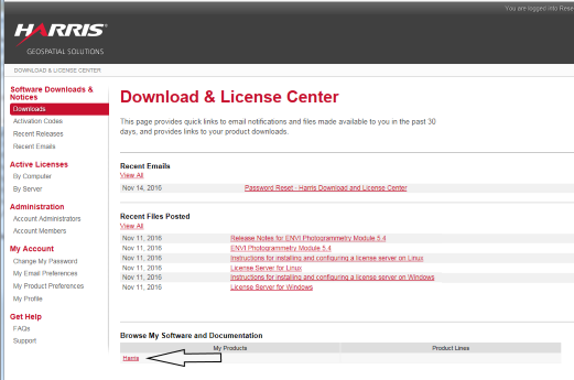 登录后,在网页底部附近的“浏览我的软件和文档”下选择“Harris”链接。