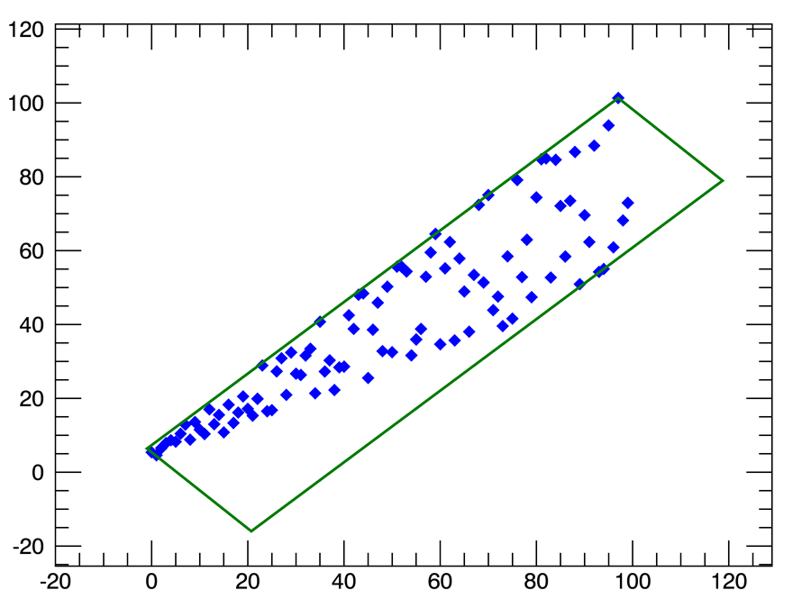 我发现自己经常在物体周围绘制边界框。我不知道为什么我这么做,但不管出于什么原因,我确实经常这样做,而且最近我想提升我的边界框绘制水平。过去,我通常只是简单地使用 x 和 y 方向上的全局最小值和最大值来获取坐标以形成边界框;然而,这并不总是最优雅的解决方案。例如,当我的数据呈现出一定的线性趋势时,我就会留下大量未被任何有价值信息填充的空白区域。