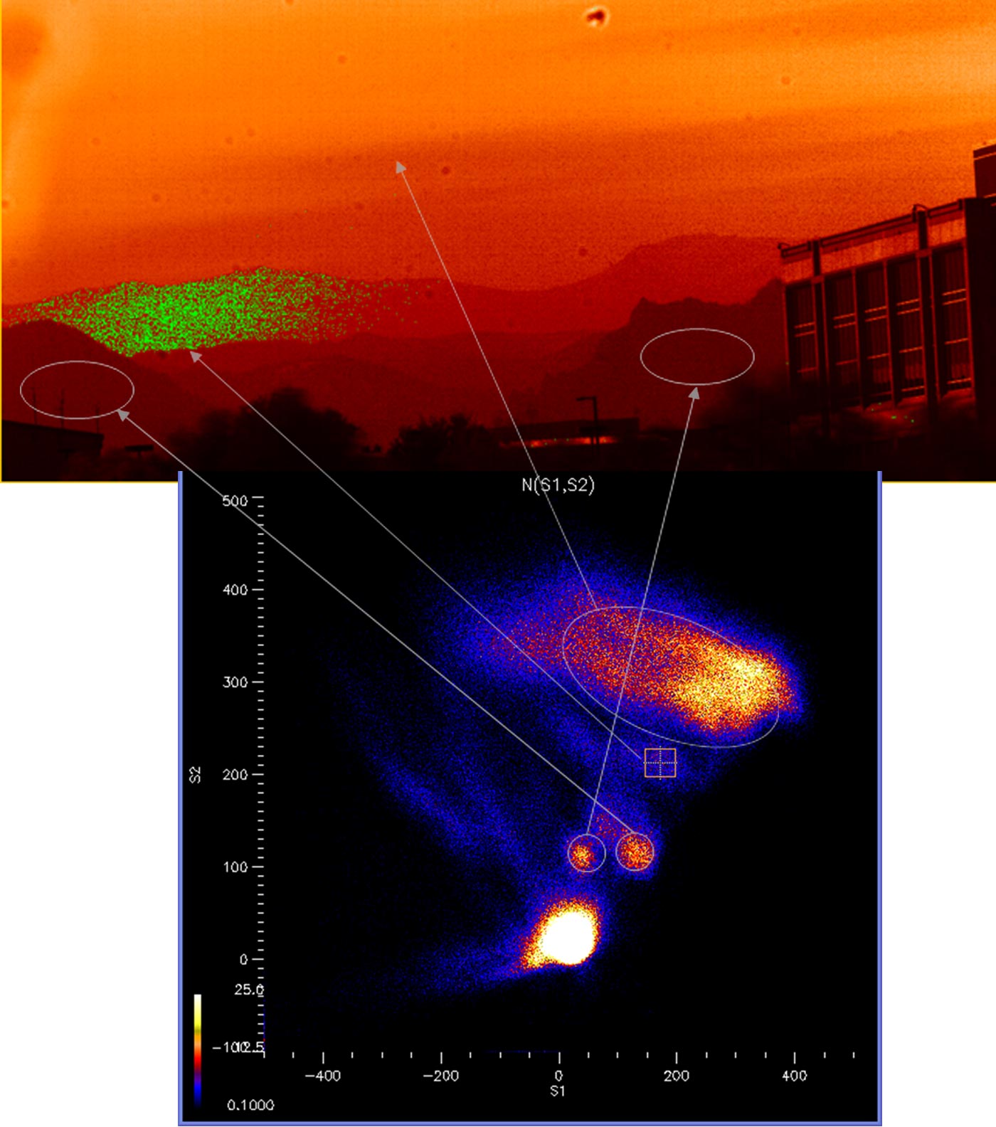 Figure 2. Eldorado Canyon data analyzed using the segmentation tool in IDL. Features in the S1-S2 histogram plot pointer box are highlighted in the S0 image as green pixels.