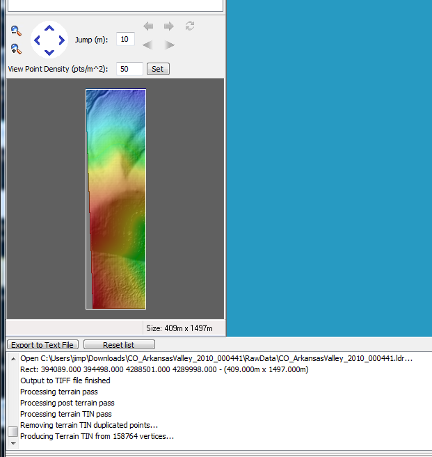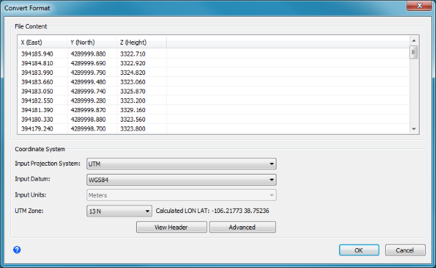 I know that this data set was collected in WGS84 in UTM zone 13 N coordinates. In reality, for our purposes of printing the data, the coordinate system is not particularly important. Unless you own a printer with an impressively large volume, we will be scaling and re-centering the units in the end, from meters to the scale of a few centimeters.