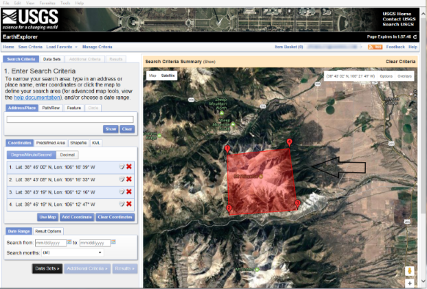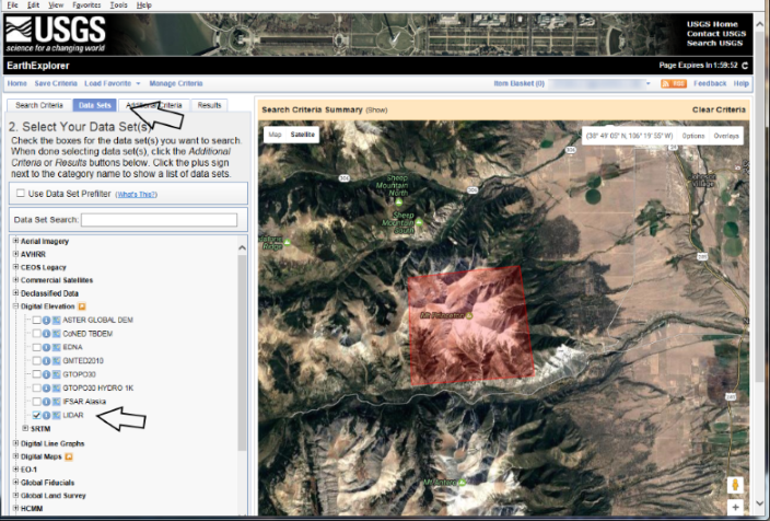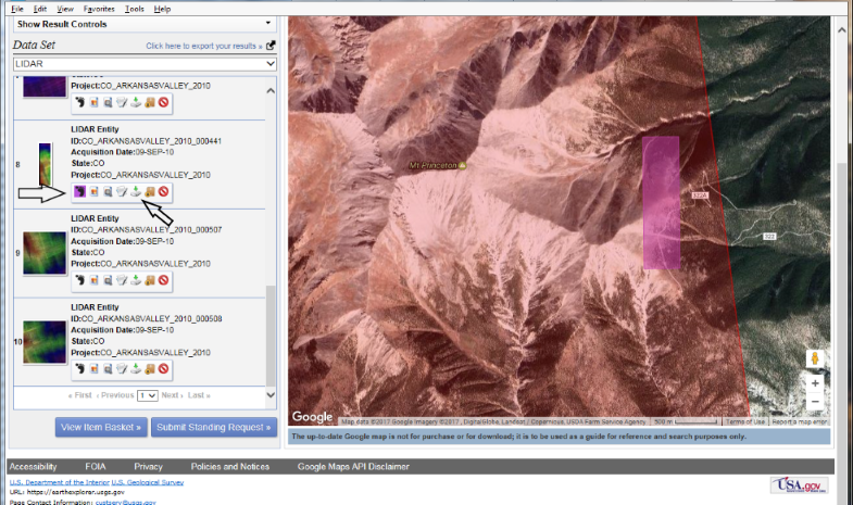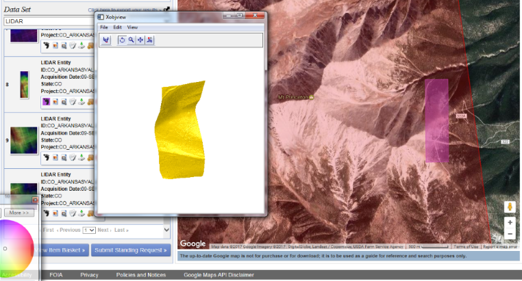 The initial goal is to determine which data sets are available for an area around the summit of Mt. Princeton. In this example, I have manually drawn a bounding box shown in red. Clicking the "Data Sets" button will bring you to the next page from which you can choose from among many data sources.