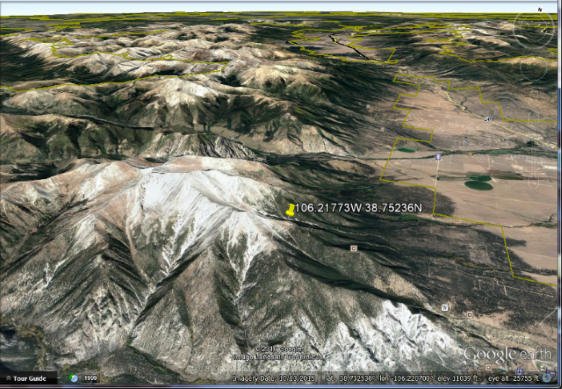 The subject of this study is a section of picturesque Mt. Princeton, a 14,196-foot peak that flanks the west side of the Arkansas River Valley near the town of Buena Vista, Colorado. Below is a Google Earth view of the region, for perspective.