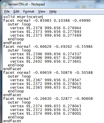 In order to feed this surface model into a printer, we must first extract the data from the ShapeFile. The ShapeFile, as produced by ENVI LiDAR only stores the triangulation as one individual entity per triangle. As a result, there is a significant amount of duplication where multiple triangles will share a single vertex. In a later step, we will need to take into account this shared connectivity when locating the perimeter vertices.