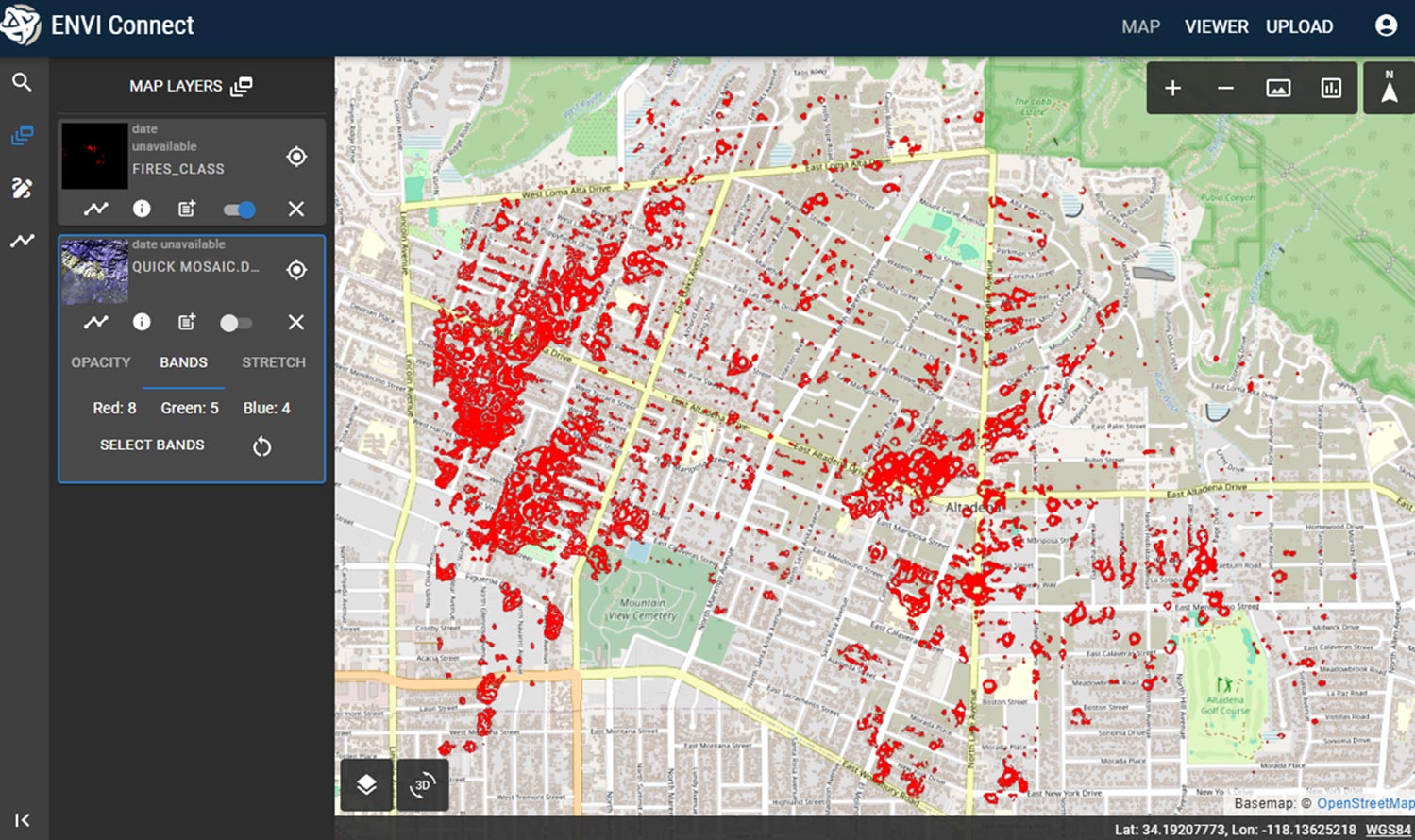 与 ENVI Connect 的集成使响应人员和分析师能够快速分享结果、进行协作并根据数据采取行动。这个工作流程展示了将先进的分类技术与无缝集成的云端工具相结合,以支持野火灾难场景中快速决策的力量。