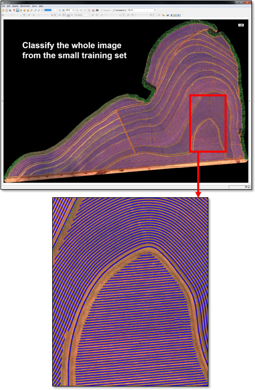 Using only a handful of labeled examples, the model learned to identify all of the crop rows. Training was a one-time process. The trained model can now be applied to other, similar images.