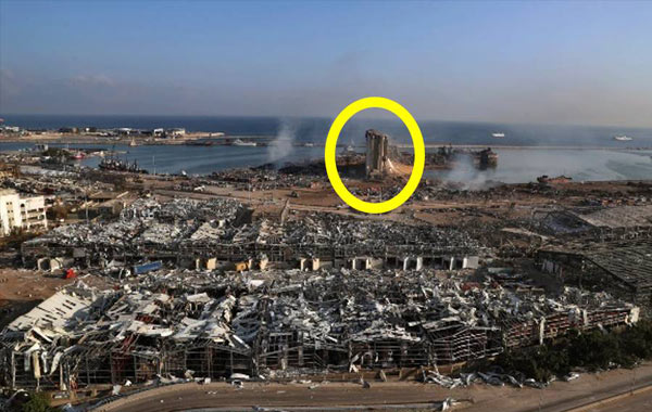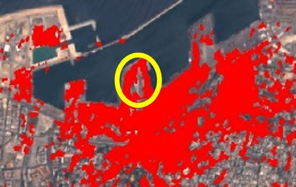 The image on the left (Bilal Hussein/AP) is the port of Beirut following the blast, the image on the right shows the intact storage elevators (not red). The red areas indicate structures altered by the explosion.