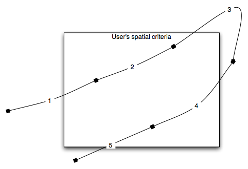 大多数视频归档系统会将传入的视频流分割成几个给定时长的片段(上图中的片段 1 到 5)。然后,当发出空间查询时,系统会返回片段 1 到 5 的全部内容,因为每个片段都有部分内容符合给定的空间标准。