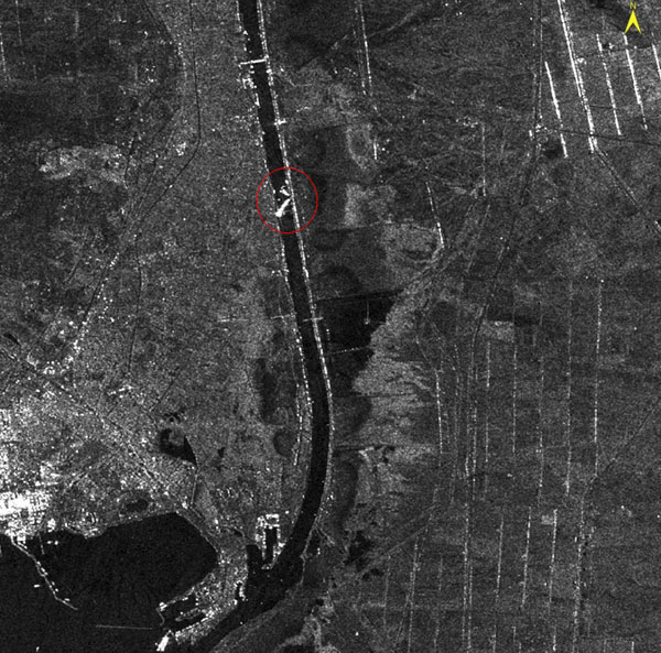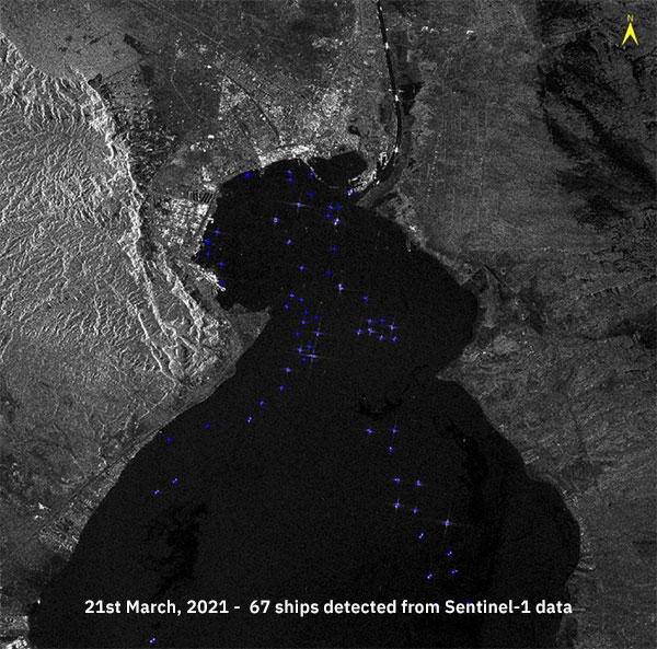 哨兵-1号SAR图像显示苏伊士运河船舶交通持续积压