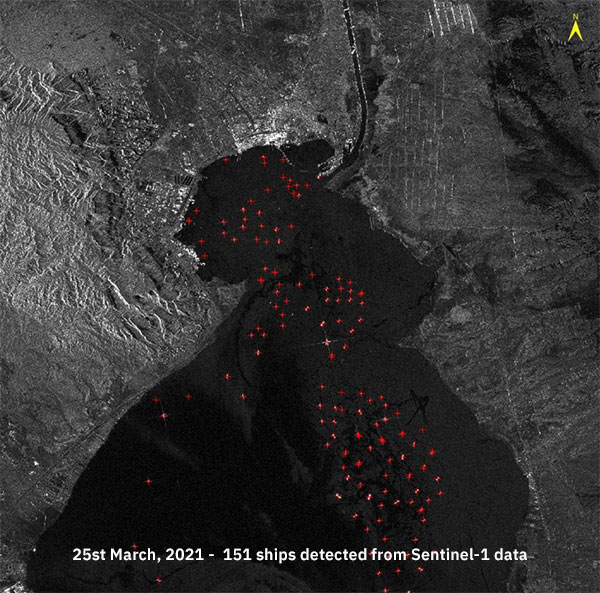上面的图像由哨兵-1号传感器捕获(数据由欧盟/欧洲航天局提供),并使用 ENVI® SARscape® 进行处理。哨兵-1A和1B传感器提供了在任何大气条件下观测地球,以及对同一地理区域进行高时间频率拍摄的能力,这不仅使我们能够近乎实时地捕捉事件,还能观察其发展过程。这些图像显示了运河堵塞前的正常交通状况,以及为进入这条每日承担全球约30%集装箱船运输量的通道而不断加剧的交通拥堵。
